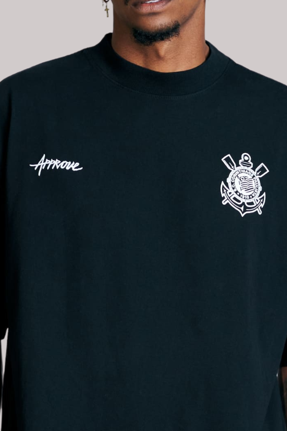 DESIGN  Estampas aplicadas em técnica de silkscreen. Conta com beneficiamentos etiqueta lateral e TAG personalizadas da Collab APPROVE X CORINTHIANS.