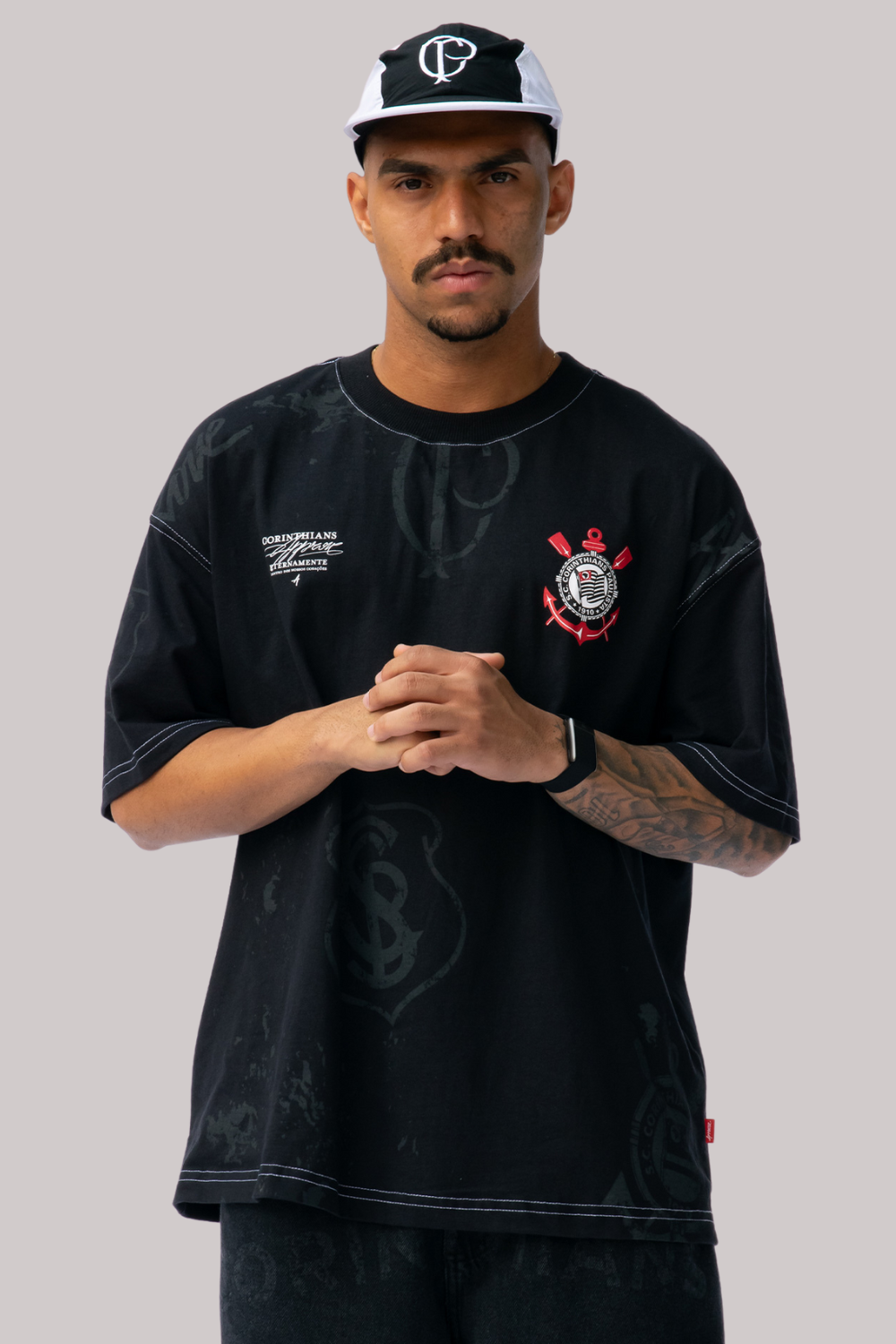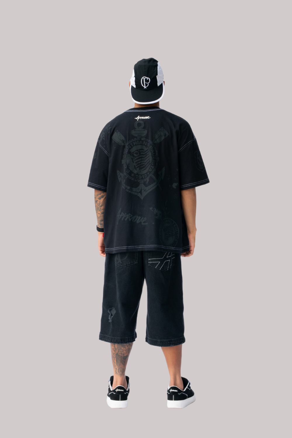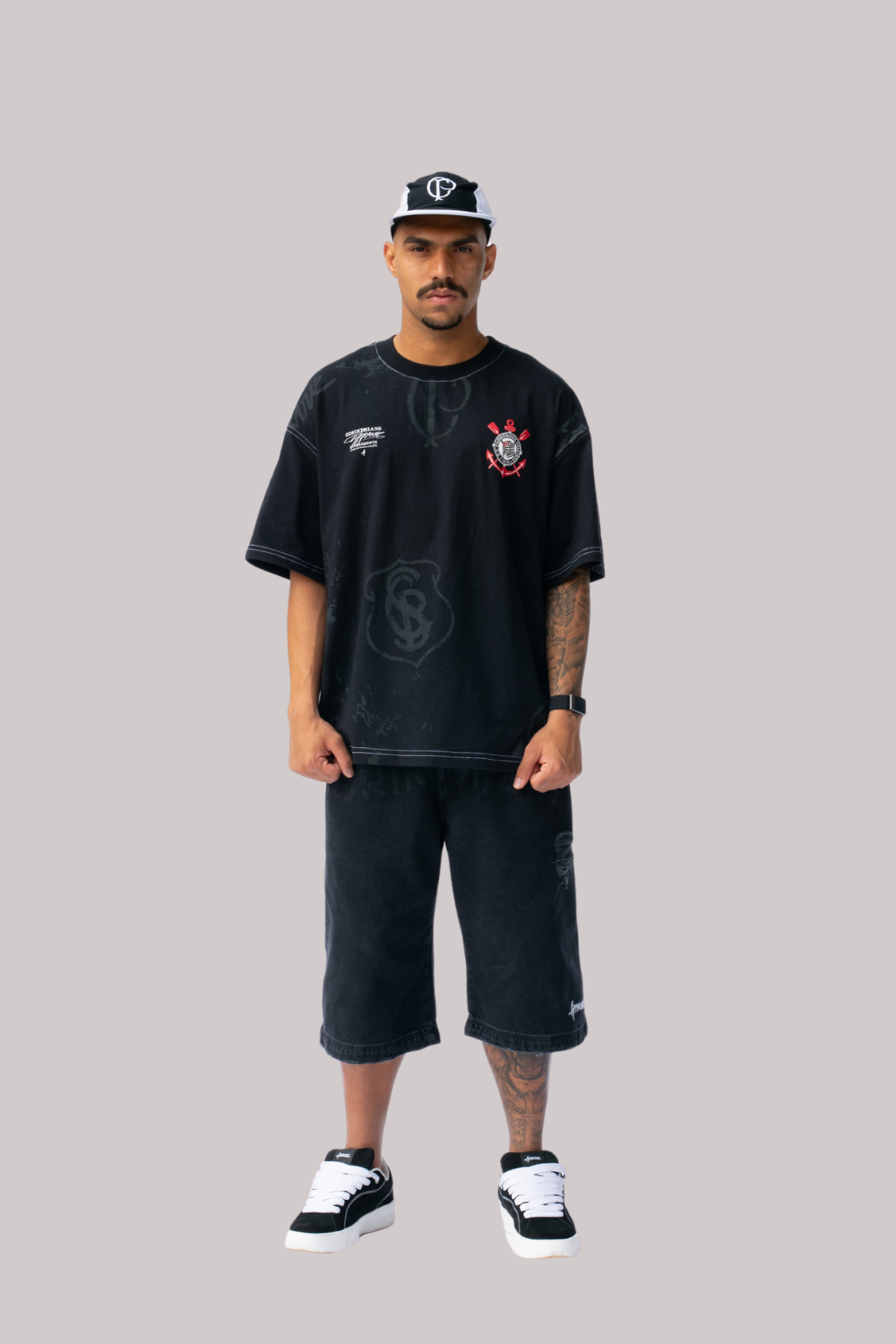 Estampas aplicadas em técnica de bordado, silkscreen e chromia. Conta com beneficiamentos etiqueta lateral e TAG personalizadas da Collab APPROVE X CORINTHIANS II.