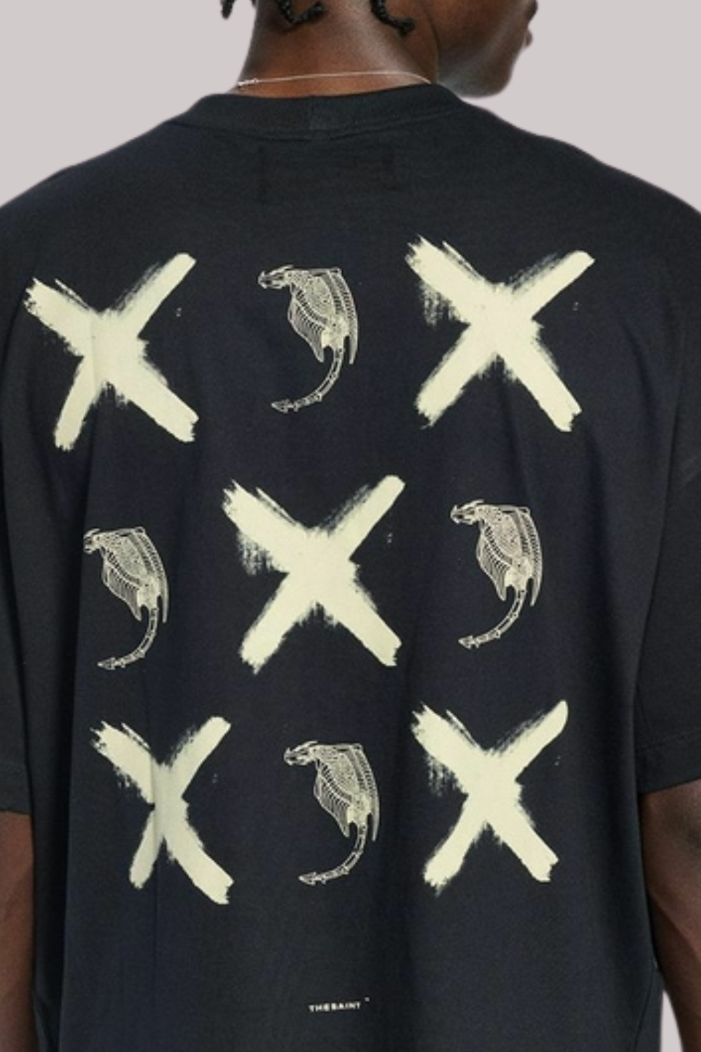 A Camiseta Nogard X apresenta um jogo da vellha com um dos dragções e o nosso X, que representa uma cruz deitada. Possui uma modelagem oversized, ideal para quem procura um corte solto com mangas mais alongadas e ombros caídos.